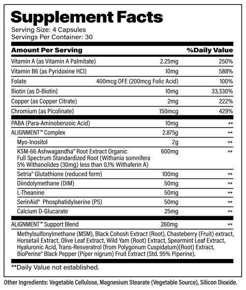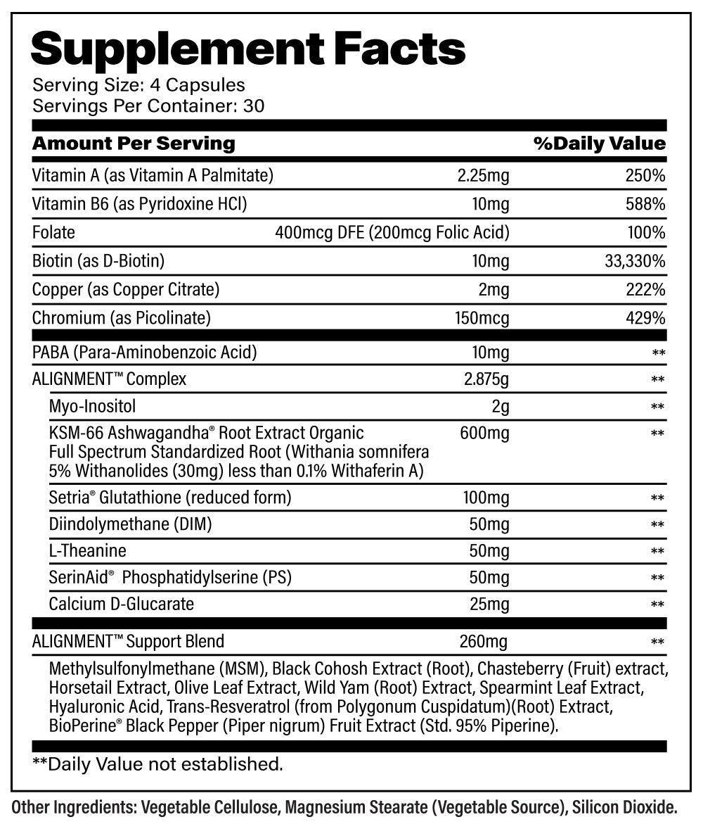 Introducing Alignment™ by Katalyst Nutraceuticals®. This ultra-comprehensive formula boasts vitamins, minerals, and other vital botanicals like the clinically-studied amount of KSM-66® Ashwagandha to help support occasional stress, balance mood, and improve energy levels. Alignment contains additional supportive nutrients like myo-inositol, DIM, chasteberry, wild yam extracts, PABA, and more.