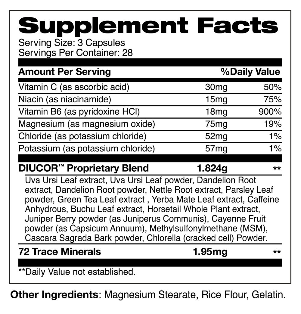 DIUCOR™ is an advanced water pill formula with a propriety herbal blend that includes Uva Ursi Extract, Dandelion Root Extract, Yerba Mate, Cayenne Fruit Extract, Cascara Sagrada Bark, Chlorella Powder, 72 Trace Minerals and hydrating electrolytes.