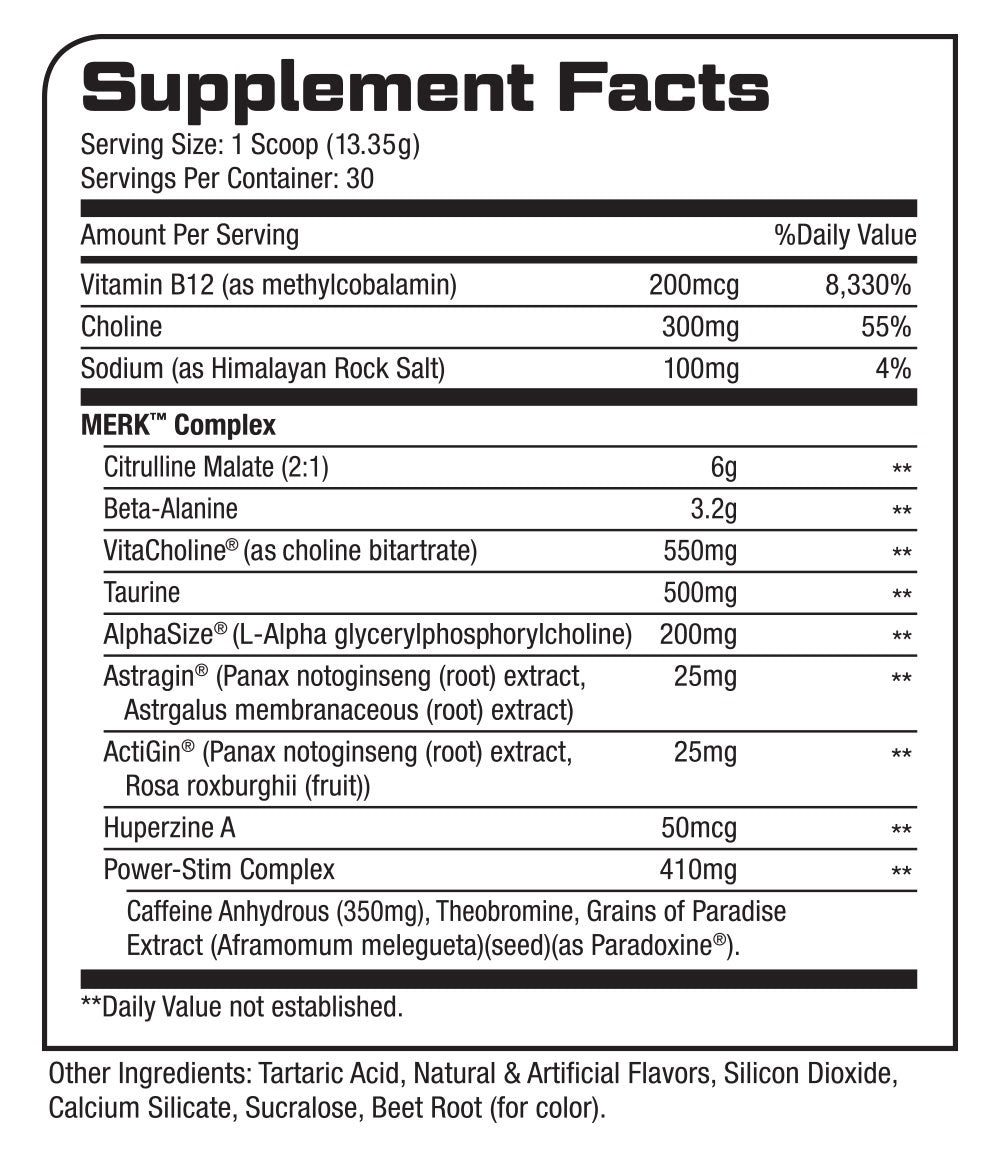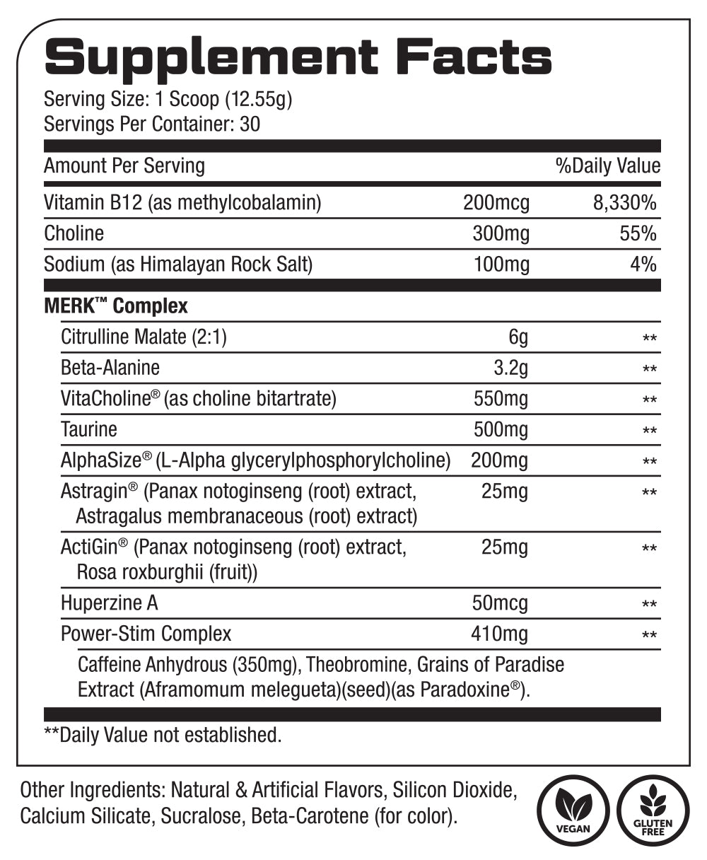 The game-changing ingredient roster that makes up MERK’s advanced formula includes 6g of Citrulline Malate, 3.2g of Beta-Alanine, 550mg of VitaCholine®, 350mg of Caffeine, and 200 mg of AlphaSize® (L-Alpha glycerylphosporylcholine). The Stance Supplements formulators didn’t stop there, though. They also included complementary ingredients like vitamin B12, Himalayan Rock Salt, Choline, ActiGin® and Astragin®. Trust us when we say, this potent performance optimizer is packed to the max with in-demand pre-workout ingredients, setting it up to revolutionize the pre-workout category!