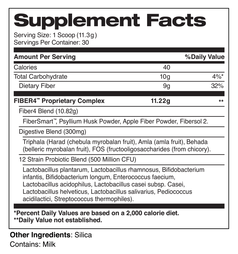 Trailhead Nutrition’s MODERN SOURCE FIBER 4™ is an advanced fiber supplement made with a unique combination of four different types of fiber along with added digestive enzymes and a 12-strain blend of probiotics. The four sources of fiber included are FiberSmart™, Fibersol® 2, apple fiber powder and psyllium husk powders. This carefully-crafted fusion of fiber types makes this formula very mixable and quite palatable.