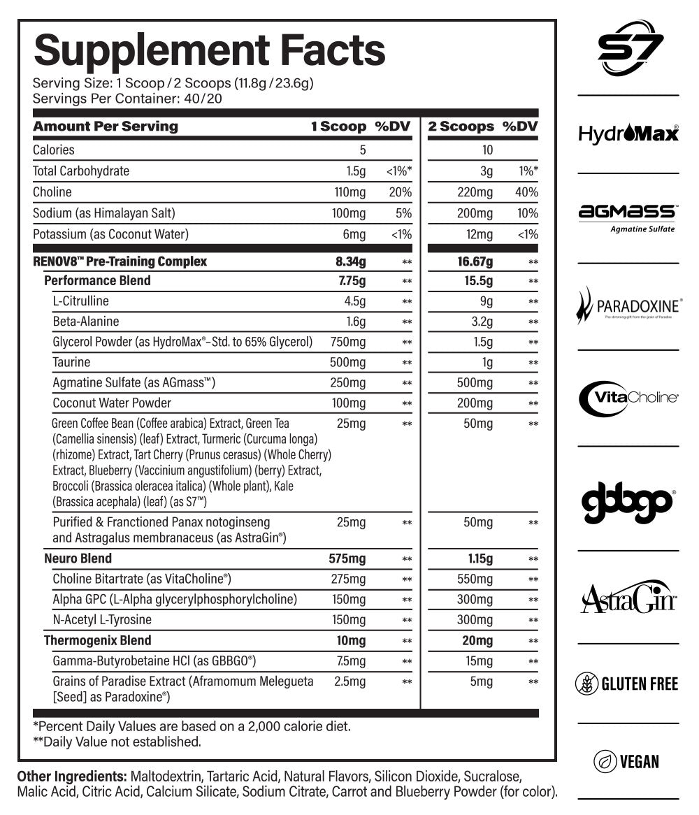 Introducing RENOV8—a fully-loaded, transparent formula that blows the lids off every other pre-workout on the market. Arriving in three variations (high stim, mid stim, and stim free) and two mouth-watering flavors, RENOV8 aims to redefine the pre-workout category as we know it. Its transparent formula boasts a slew of precisely-dosed ingredients that serve as the backbone to its disruptive mission of stripping the industry of mediocrity. Equipped with an array of curated blends designed to maximize pump, focus, energy, and heat, RENOV8 proves itself to be anything but ordinary.