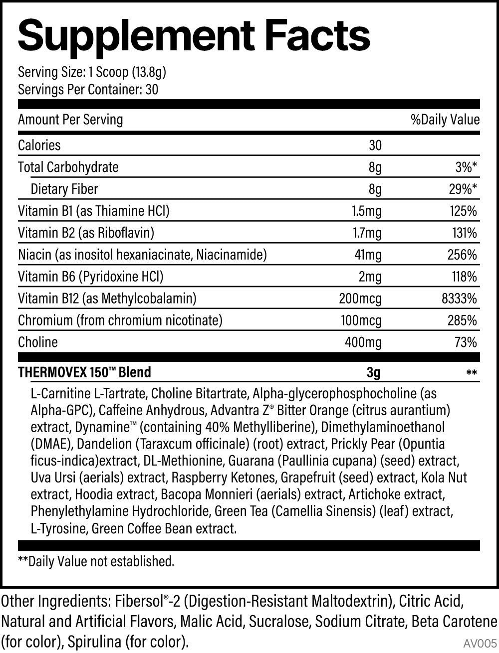 THERMOVEX 150™ delivers the same incredible ingredient profile that fitness-minded consumers nationwide have come to love but with less caffeine—150mg to be exact. And just like the original version, which is still a top-seller to this day, the first thing you’ll notice about THERMOVEX 150™ is the taste. With 3 refreshing, lip-smacking flavors like Tropical Shaved Ice, Pink Lemon Squeeze, and Green Apple Smash, each one is so delicious you’ll want to try all three! Beyond the flavor, THERMOVEX 150™ is an advanced thermogenic formula containing L-Carnitine, Alpha-GPC, Dynamine™, Advantra Z®, 150mg of caffeine, a host of potent B vitamins, as well as other proven thermogenic ingredients. Plus, it delivers 8g of fiber per serving.